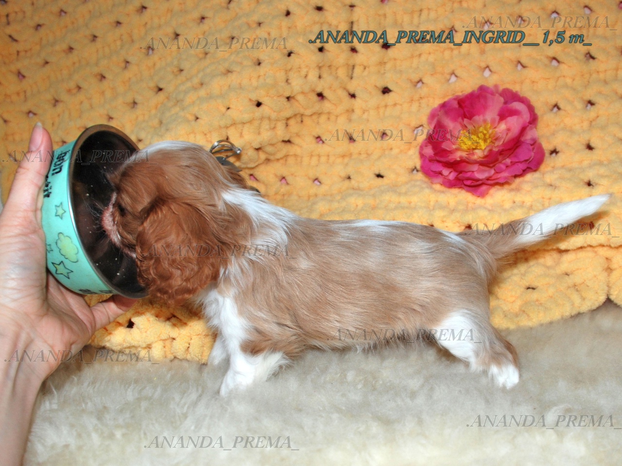 Девочка ANANDA PREMA INGRID, Отец: AURO CONCURR JANLUCCA, Мать: VOL DE L'ANGE PARFAIT AMOUR MIST. Окрас Блен-хейм. Изуми, по характеру мягкая, нежная, истинно девочка, ласковая, ориентирована на человека. Документы РКФ, привита по возрасту, всесторонняя поддержка питомника.